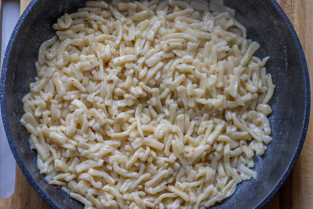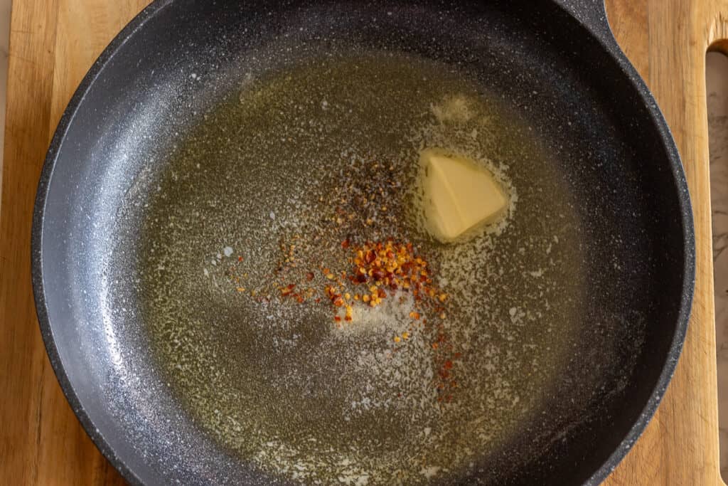 - In a large pan, melt the butter, season with salt, pepper, and chili, and toss in the cooked noodles.