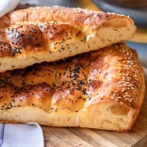 Turkish Pide Bread (or Ramazan Pidesi) is a classic Turkish flatbread that is traditionally baked during the fasting month of Ramadan. It is crispy on the outside and soft on the inside, with a delicious nutty flavor from the sesame or nigella seeds.