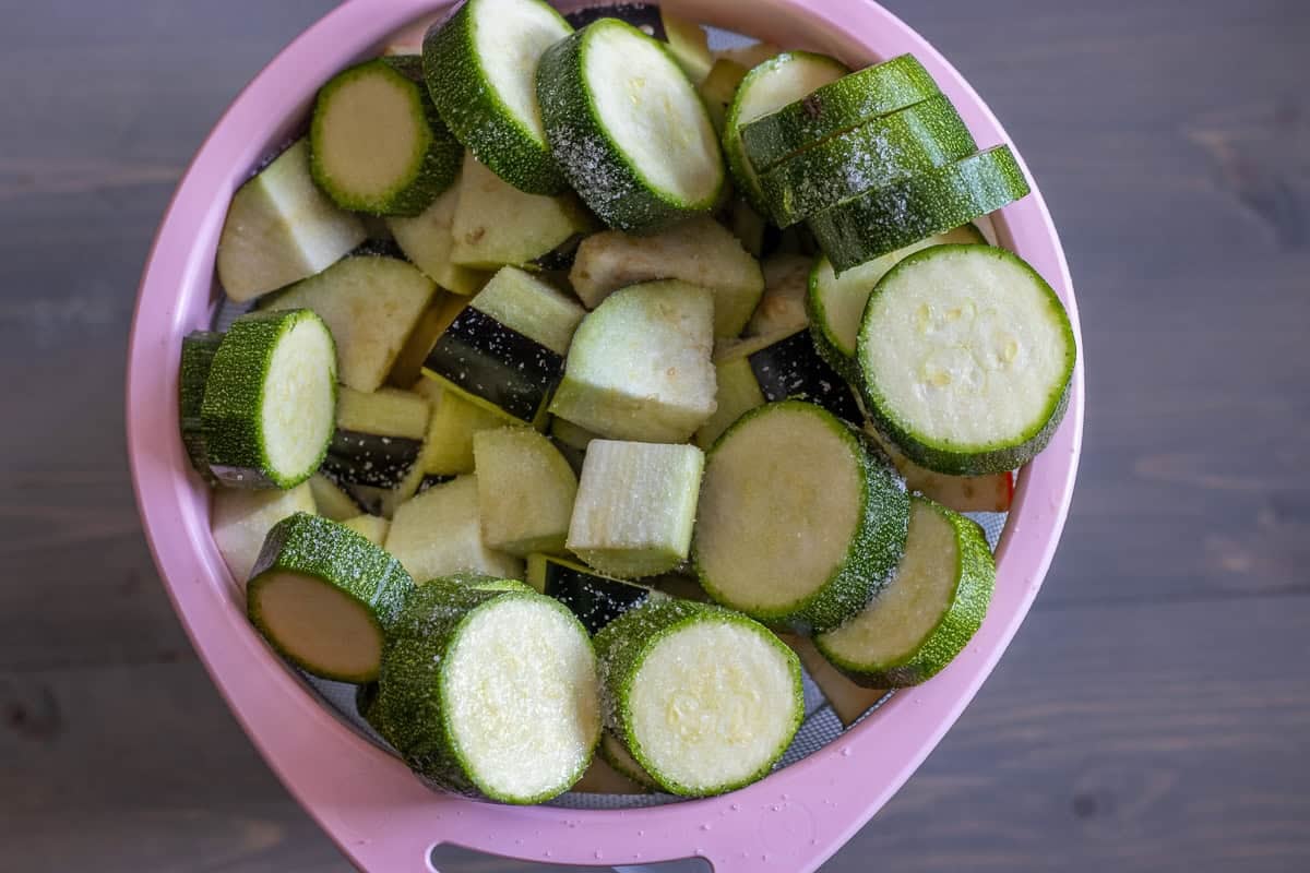 - If using eggplant and zucchini, lightly salt them and place on a colander to get rid of excess water.
