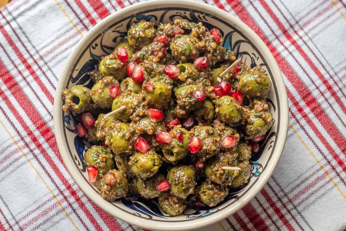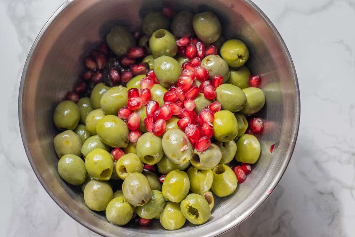 - In a large bowl, mix the paste with pitted green olives and 2 tablespoons of pomegranate arils. Ensure all olives are thoroughly coated.