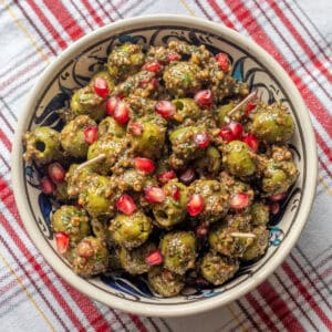 - Pomegranate molasses - It is a thick syrup made with pomegranate juice, and I often use it in Middle Eastern recipes. It has an intense sweet-and-sour flavor and adds a sweet and tangy depth to green olives. You can buy it from most Turkish / Middle Eastern shops or online from Amazon.