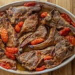 Place the seasoned lamb chops on top of the vegetables and arrange the tomato wedges in between chops. Pour any leftover seasoning mixture from the bowl over the top.