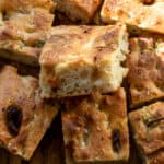 Let the focaccia cool down for a few minutes in the pan, then place it on a wire rack to avoid its bottom getting soggy. Let it cool down for 20 to 30 minutes before cutting it into squares.