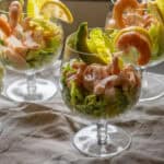 I like to cut my prawns in half lengthwise because it looks nicer, but you can also chop them into chunks if that’s easier. I keep 4 whole prawns for garnishing the prawn cocktail.