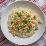 Add the roasted cauliflowers along with the butter, check the seasoning and add some salt. Parmesan cheese will season the risotto as well so add slightly less salt than needed.
