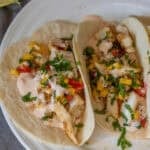 To assemble the fish tacos, warm the tortillas in a dry skillet over medium heat for about 30 seconds on each side, or until soft and flexible.
