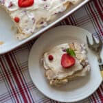 Combine the stiffened egg whites and ¾ of chopped strawberries with the mascarpone mixture. Use a silicone spatula to gently fold the ingredients from the bottom to the top.