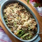 Place the green beans in a baking dish or casserole, sprinkle the remaining fried onions evenly over the top of the beans, and then scatter the grated cheese on top of the fried onions.