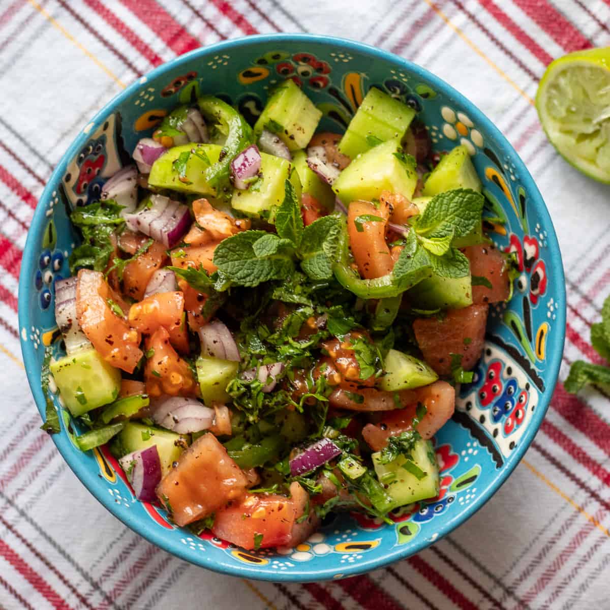 The vegetables for Persian Shirazi Salad should be fairly finely chopped, but not so small that the vegetables become mushy. They are meant to be fresh and crunchy.