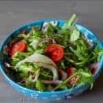 Rocket and Parmesan Salad is a peppery and tangy side dish made with rocket (arugula) leaves, parmesan shavings, red onions, and tomatoes dressed with a simple dressing consisting of olive oil and balsamic.