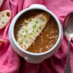 If you don’t have oven-proof individual bowls or ramekins, you can grill the cheesy baguettes separately on a tray and place them on soup ladled in bowls.